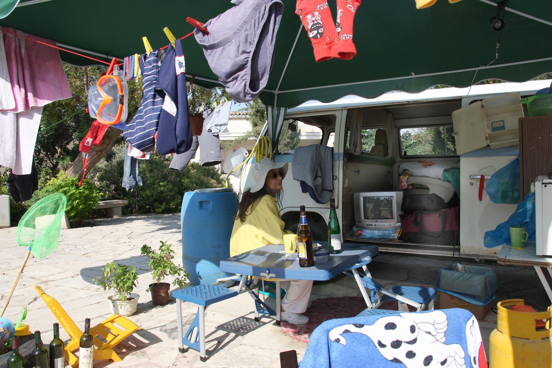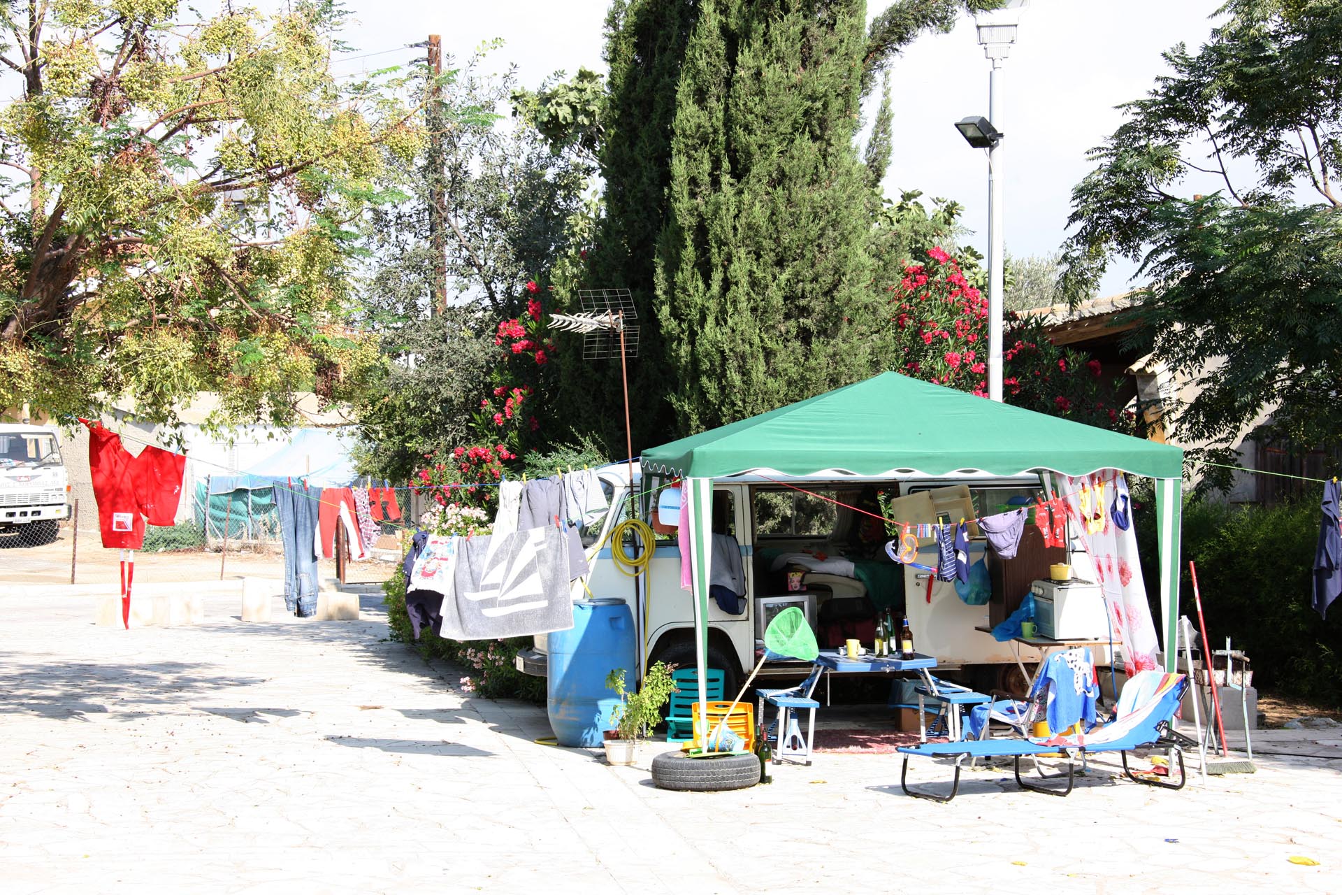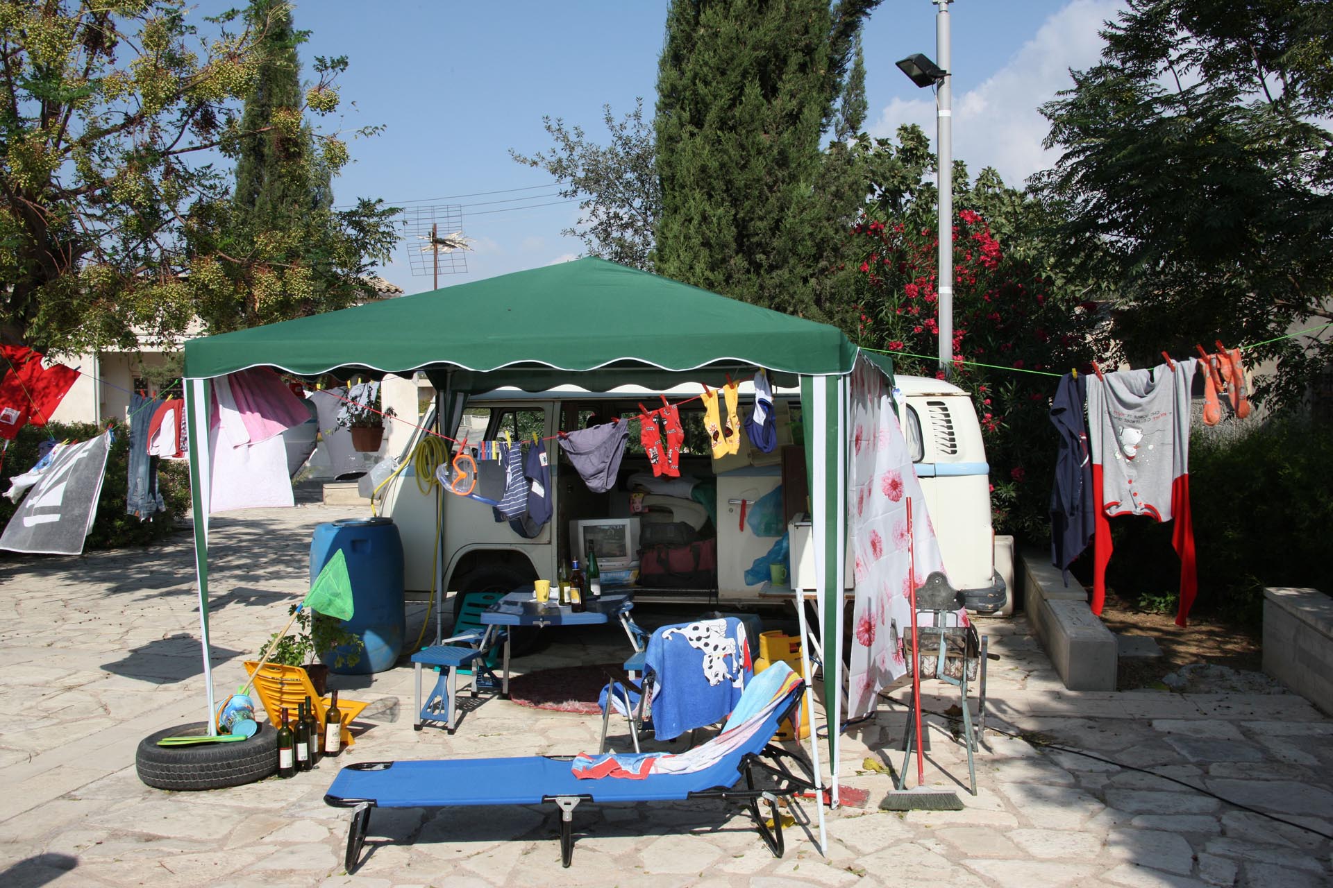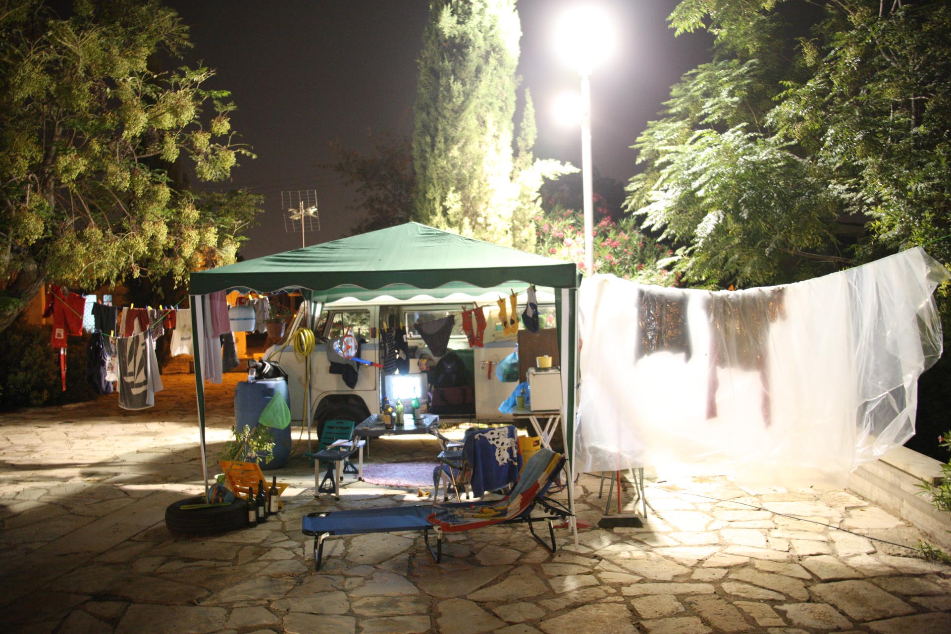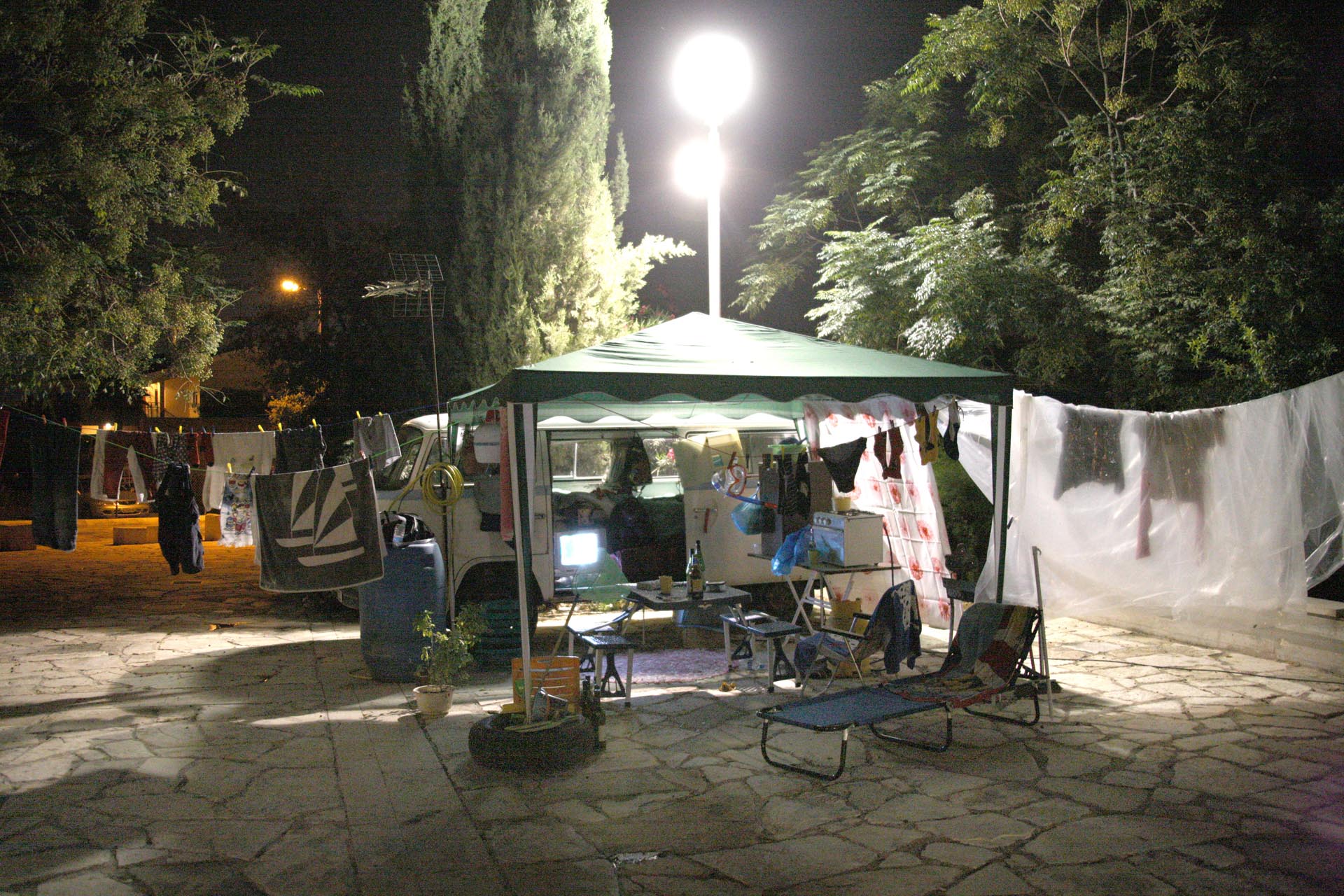 My wife threw me out is an installation performed for a week in Aglantzia, a small municipality of Nicosia, Cyprus. Armed with very basic amenities - food, water, electricity, clothes, a bed - this mobile ‘home’, a white caravan, ‘secures’ a place in a public square, and artist, Panikos Tembriotis, is there to perform this imagined, or not, refuge for seven days. Might it be the birth of a camping site? A ‘homeless’ man trying to start a temporary public life? An urban ‘Berliner’ unwilling to give up on the loss of the prospect of creating new communal life in a public square?
